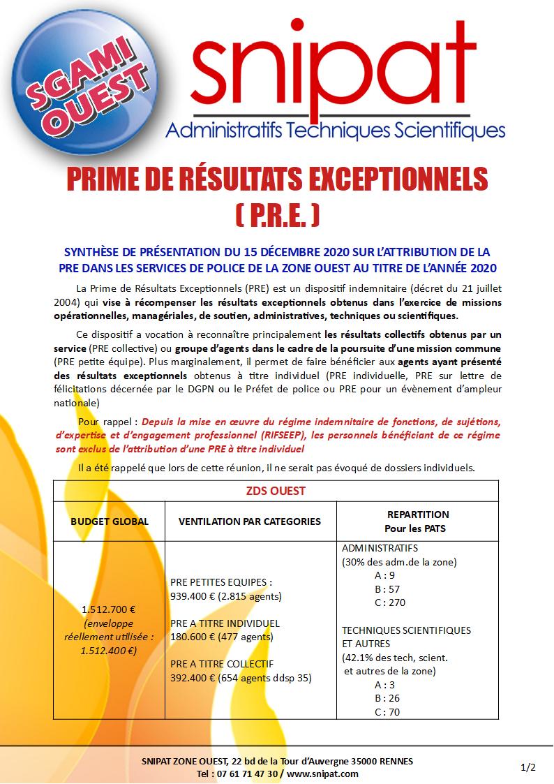 Synthèse de présentation du 15 décembre 2020 Sur l’attribution de la PRE dans les services de police de la ZONE OUEST au titre de l’année 2020