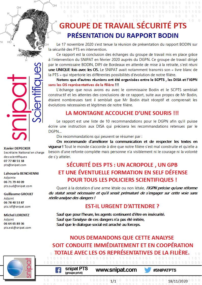 Ce rapport est la conclusion des échanges du groupe de travail mis en place grâce à l’intervention du SNIPAT en février 2020 auprès du DGPN. Ce groupe de travail dirigé par le commissaire BODIN, DIPJ de Bordeaux en attente de mise à la retraite, s’est réuni une UNIQUE fois avec les OS. Le SNIPAT avait notamment transmis son « livre blanc de la PTS » qui répertorie les différentes possibilités d’évolution de notre filière.