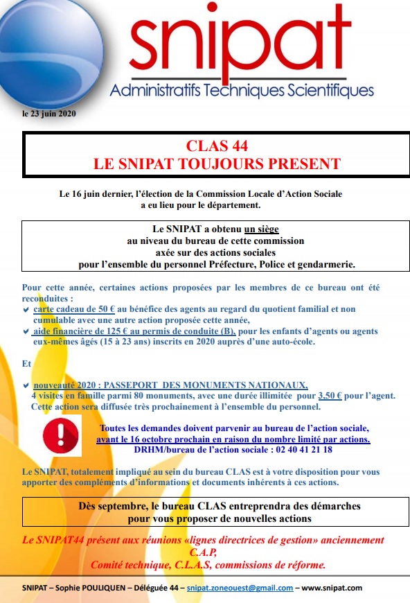 Sophie POULIQUEN, déléguée SNIPAT du département Loire Atlantique, siège à la Commission Locale d'Action Sociale et se tient à votre disposition pour toutes vos questions
