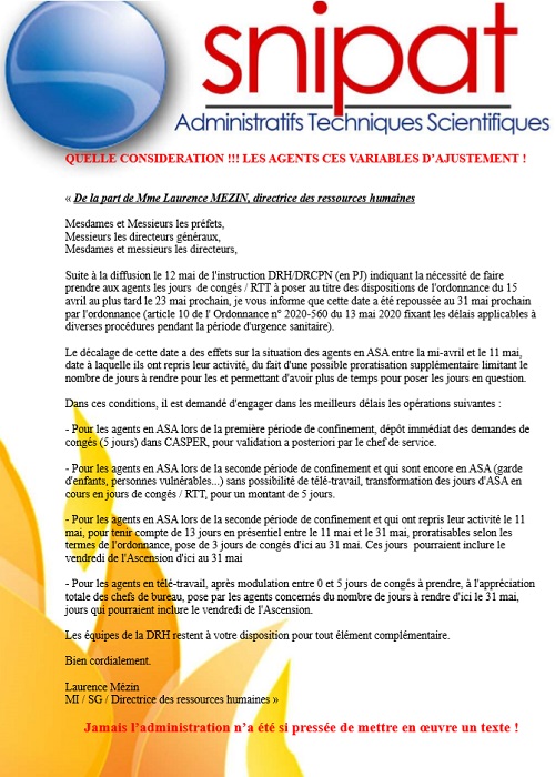 La DRCPN et la DRH ont vite vite sorti une instruction pour calculer le nombre de jours de congés que les collègues allaient perdre suite à la crise du covid19.