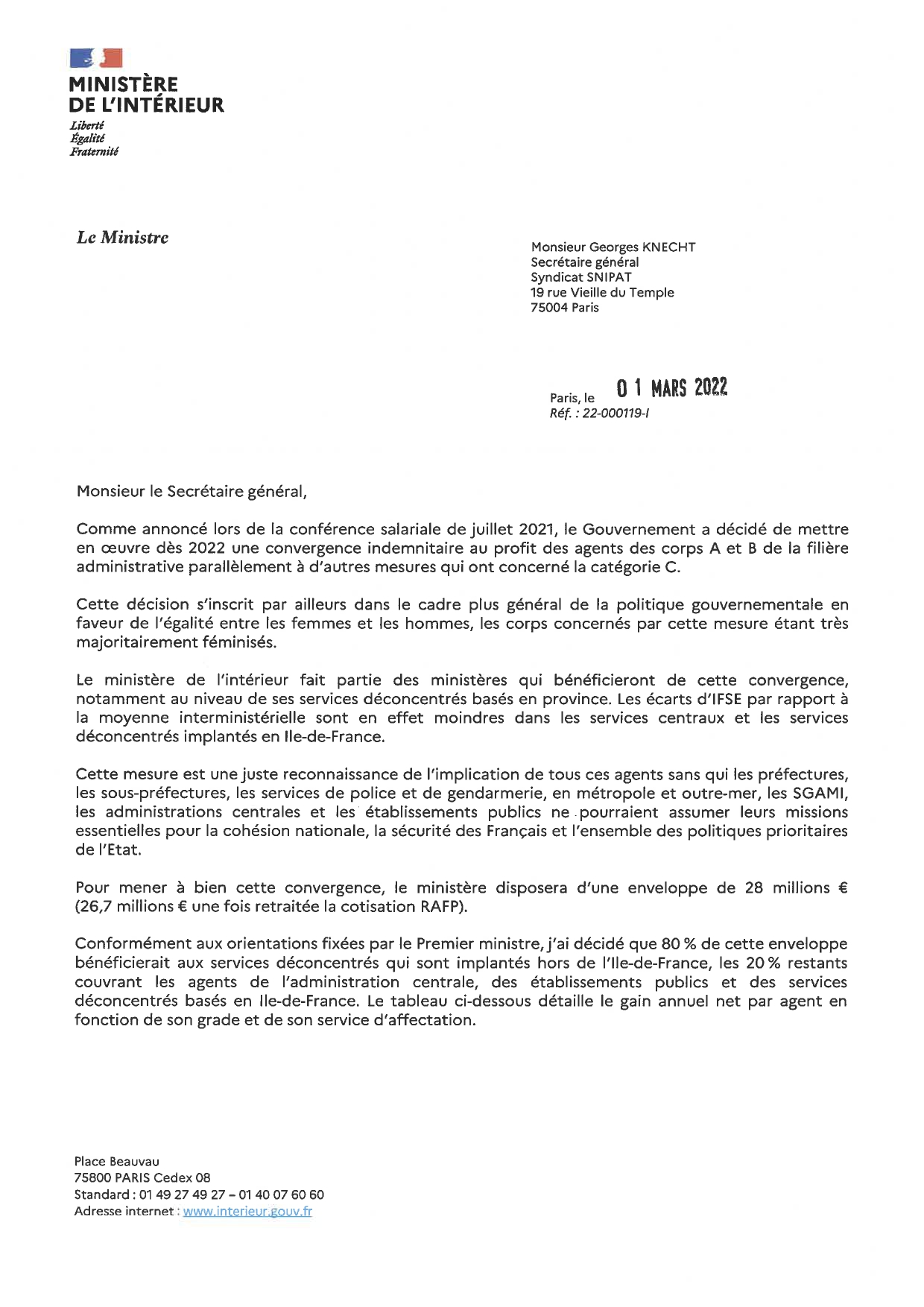 Conformément aux engagements de "convergence indemnitaire " des catégories A et B voulus lors de la conférence salariale Fonction Publique de juillet 2021, le ministre a décidé sans plus attendre de revaloriser davantage les services de province , ce qui correspond a une des revendications du SNIPAT.
