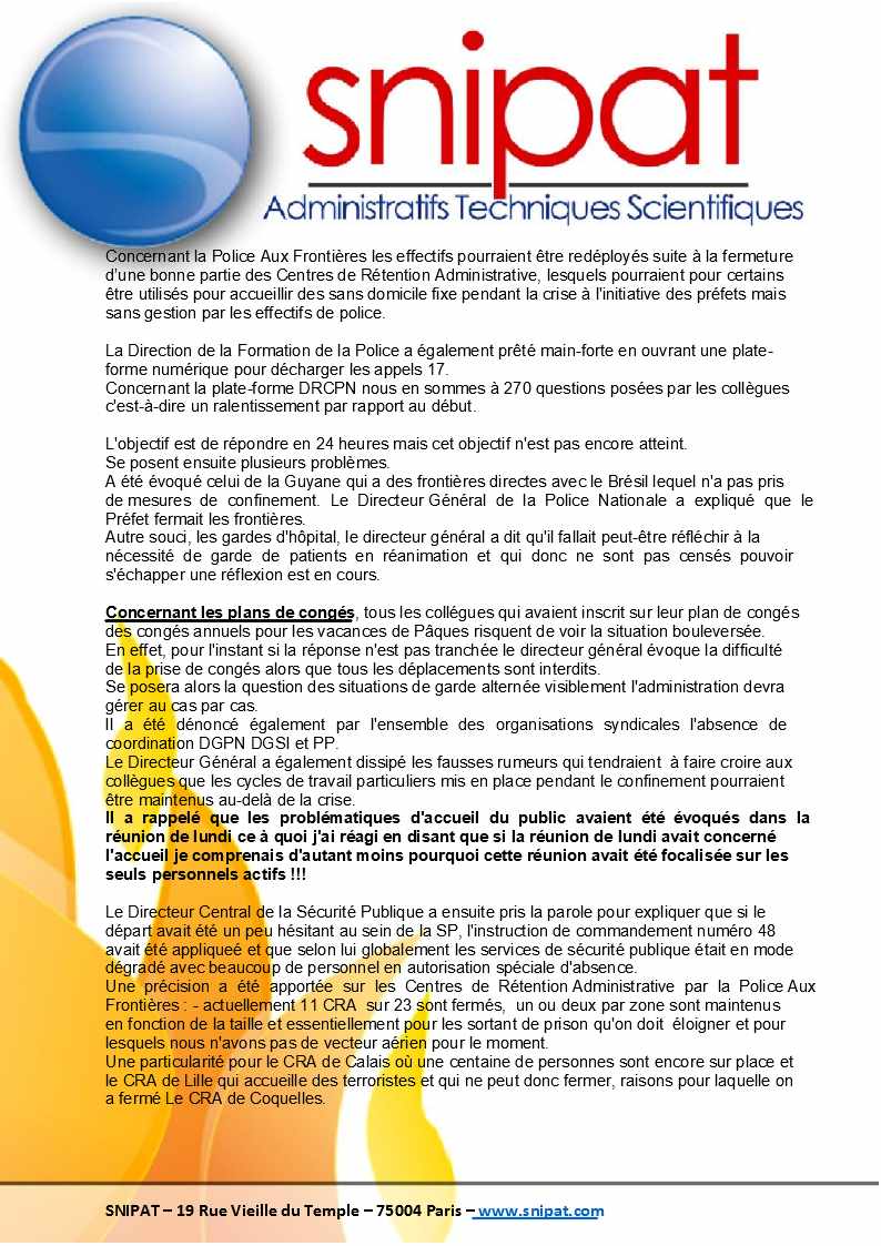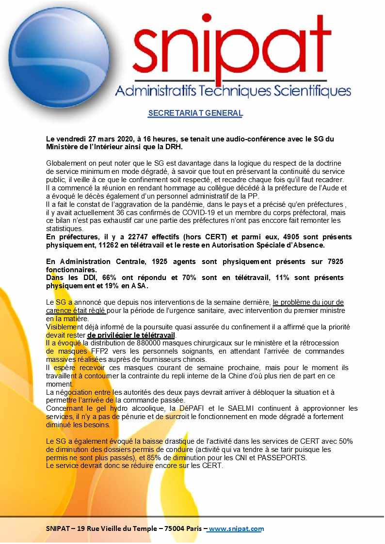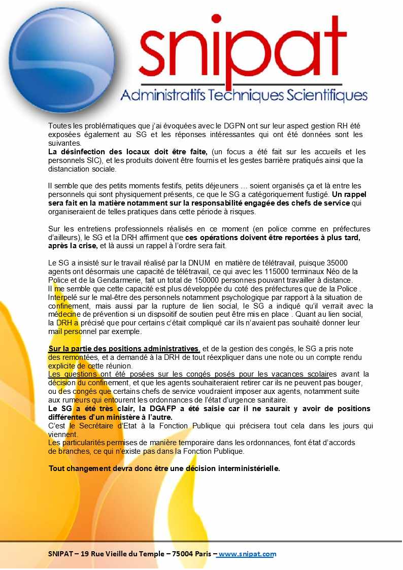 Vous trouverez infra le compte-rendu des réunions DGPN du 26 mars 2020 et Secrétariat Général du 27 mars 2020.