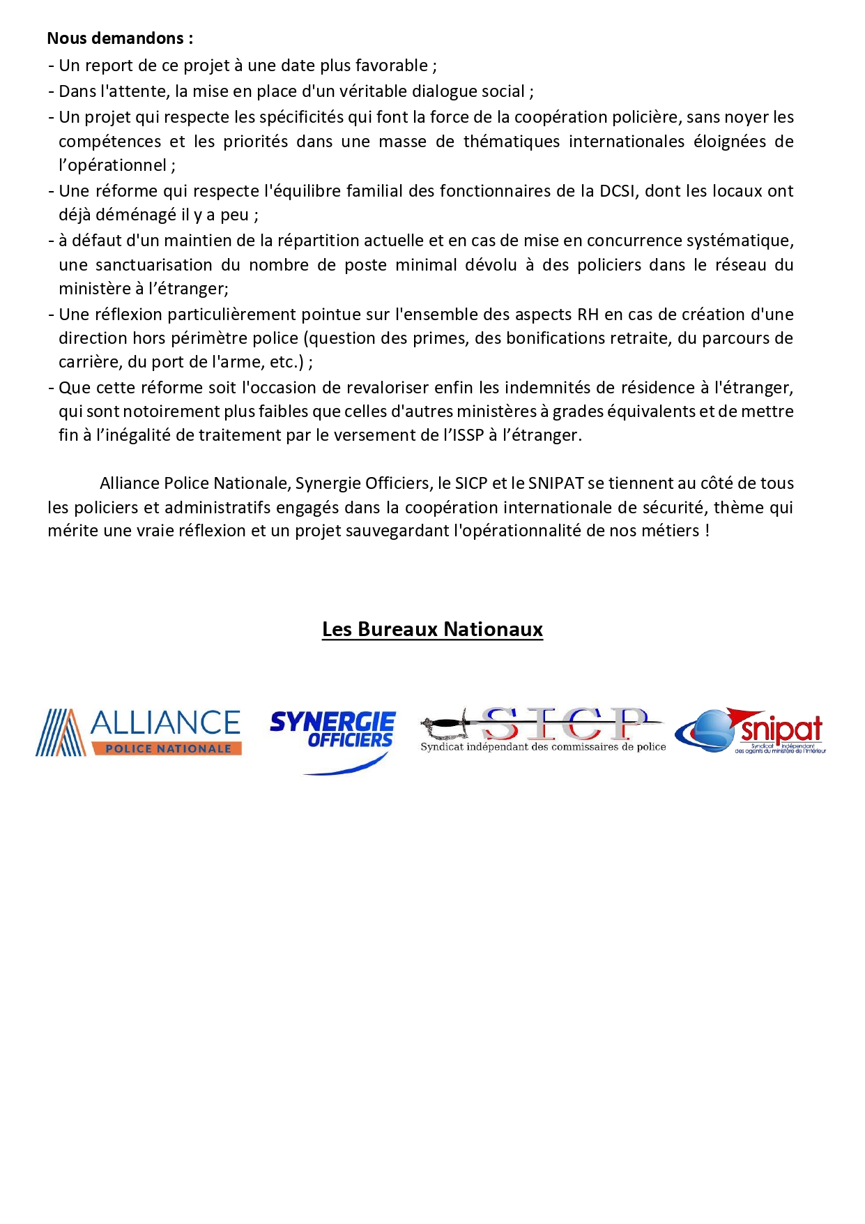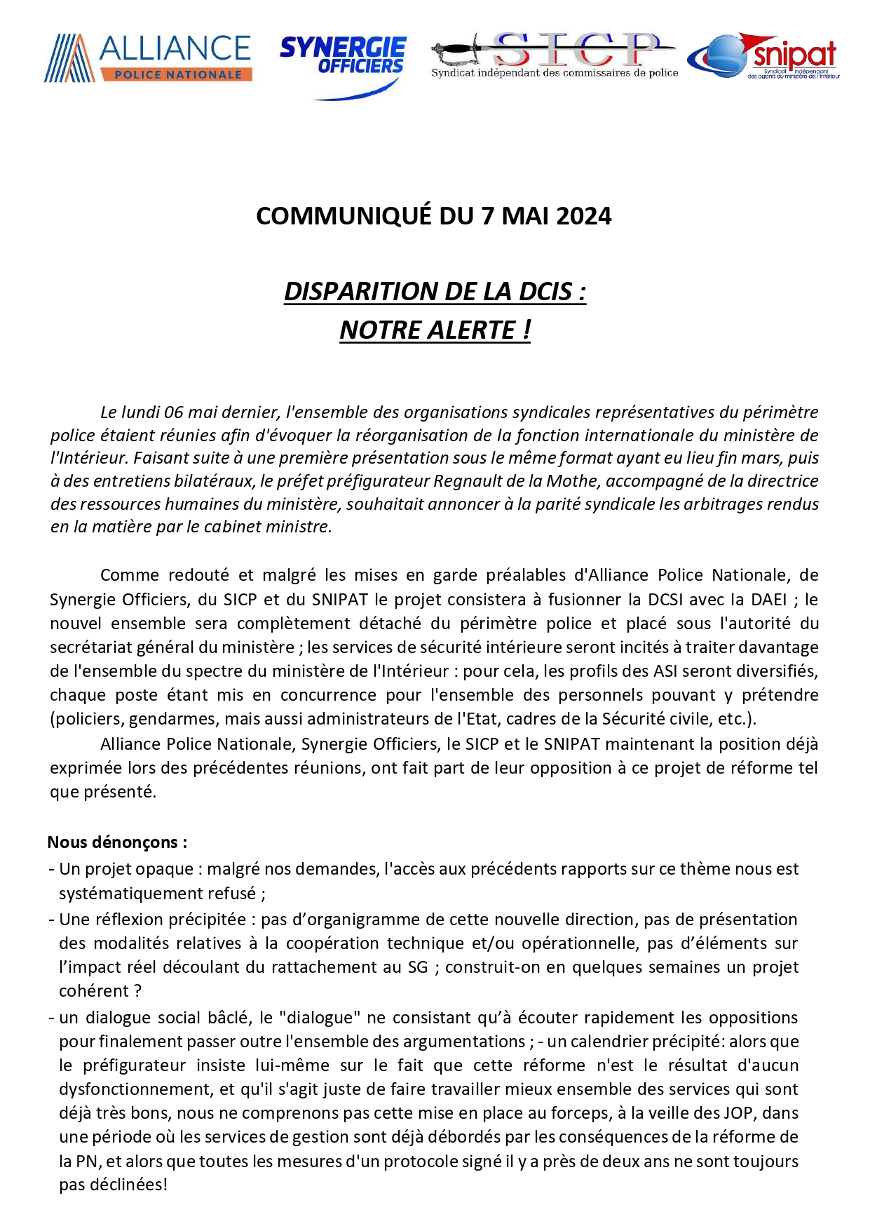 Communiqué de presse du SNIPAT, ALLIANCE PN, SYNERGIE OFFICIERS, SICP