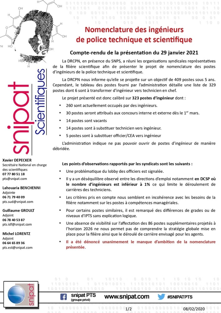 Vous trouverez ci-dessous le compte-rendu de la présentation du 29 janvier 2021 concernant le projet de nomenclature des ingénieurs de police technique et scientifique.
