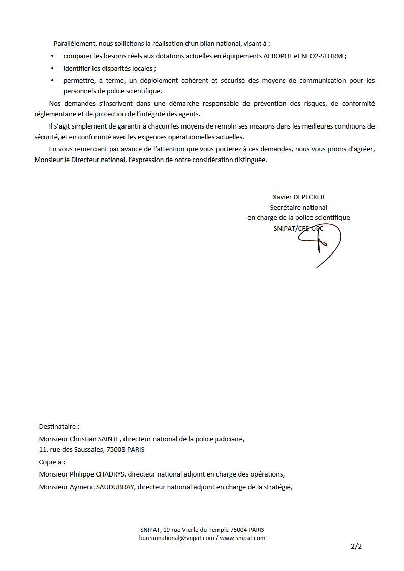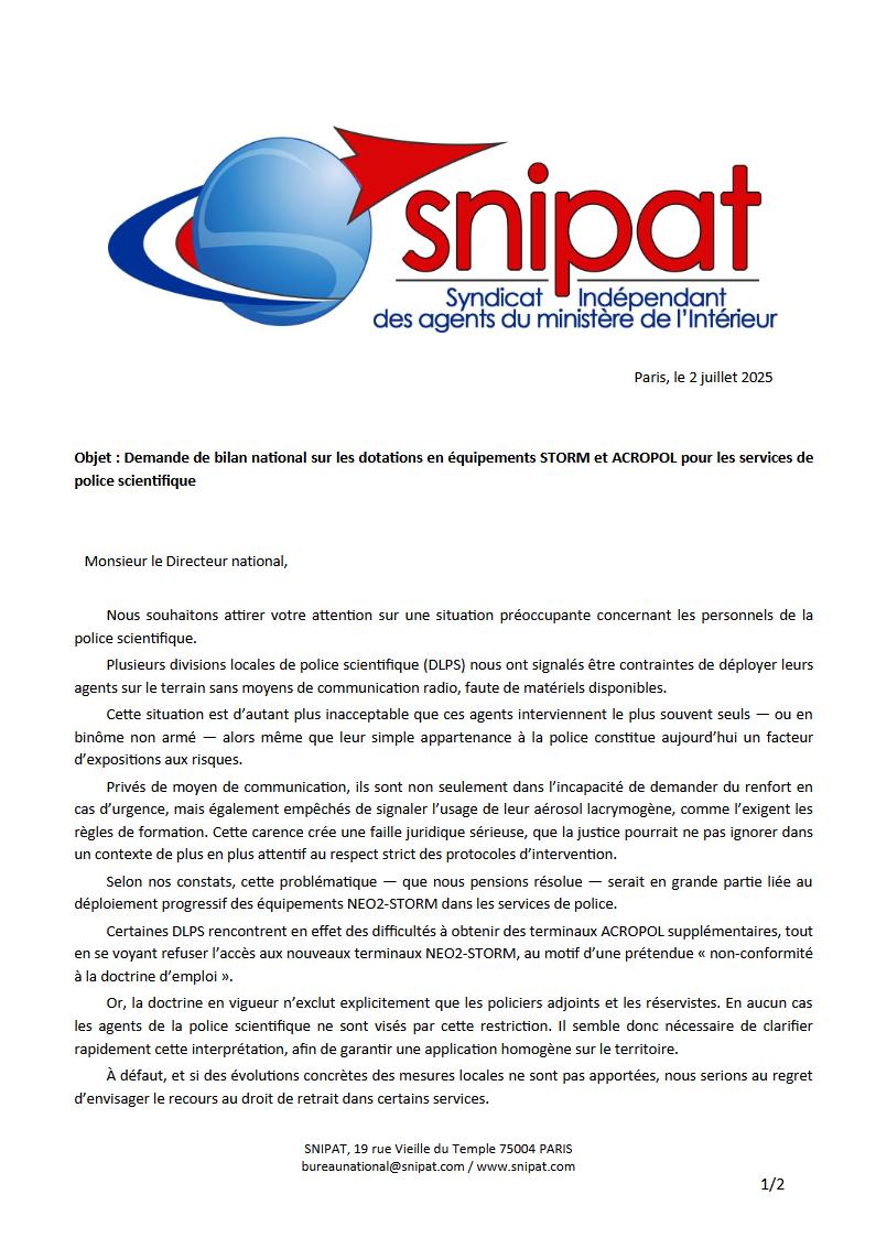 Demande de bilan national sur les dotations en équipements STORM et ACROPOL pour les services de police scientifique