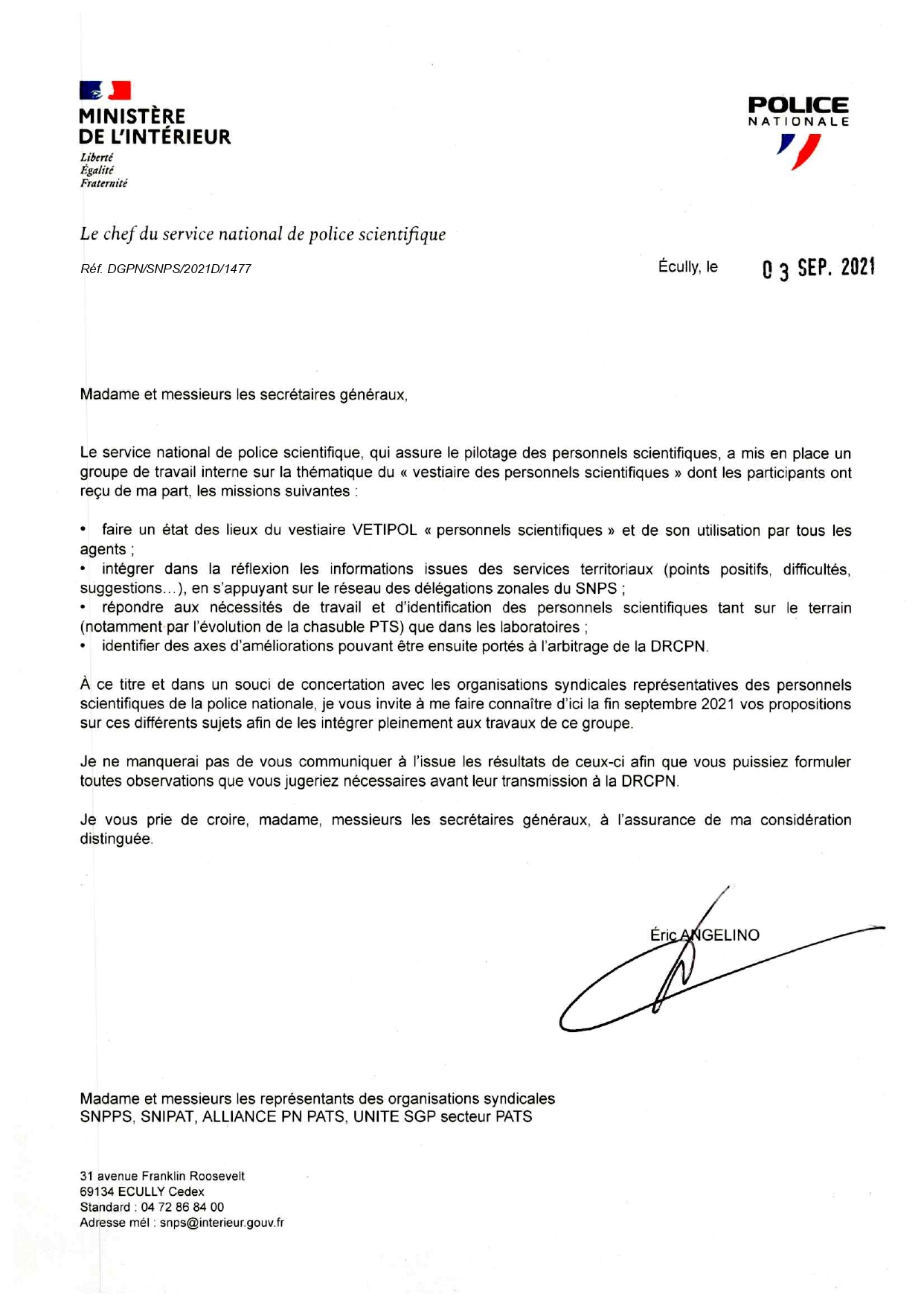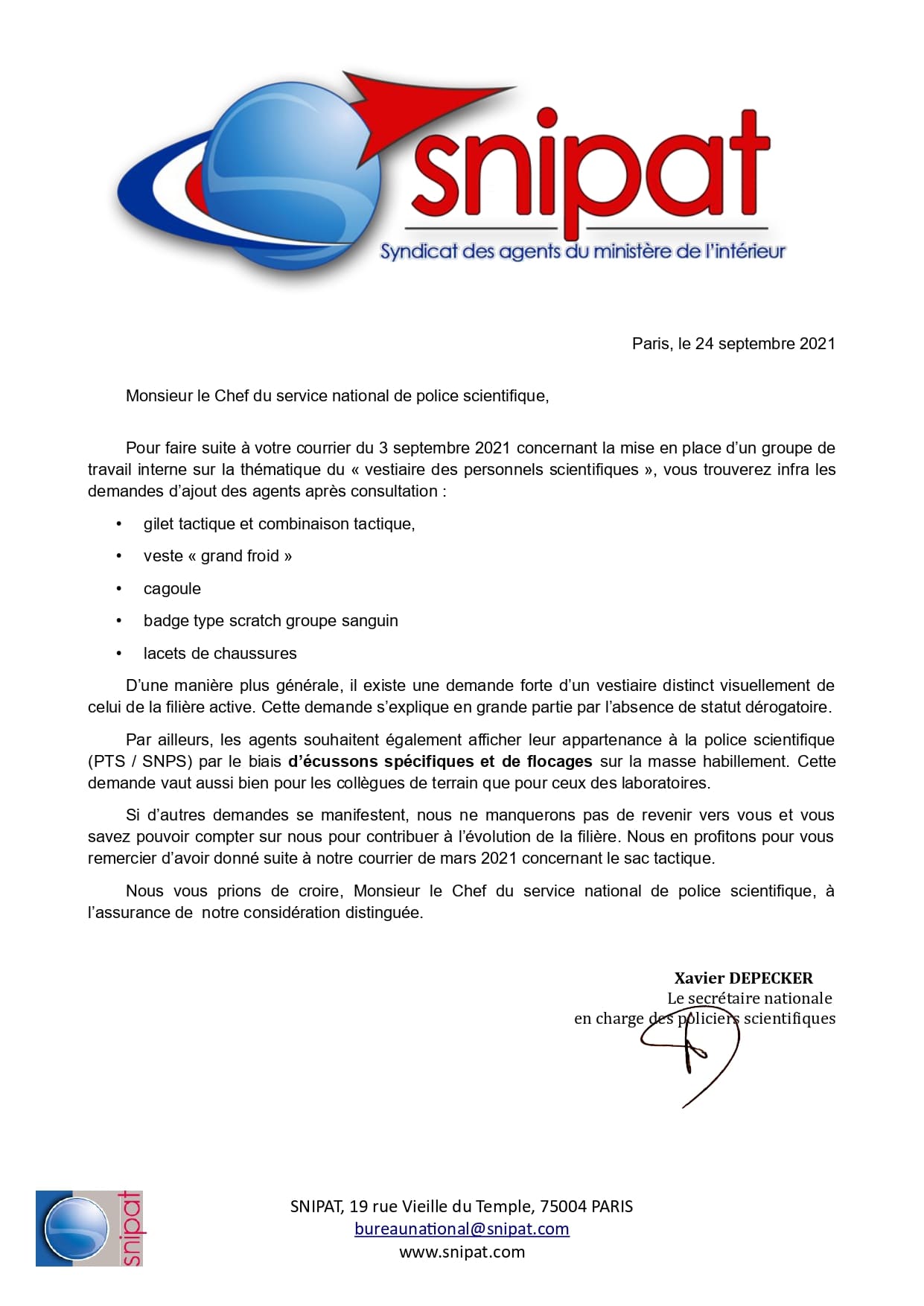 Vestiaire police scientifique : contributions SNIPAT